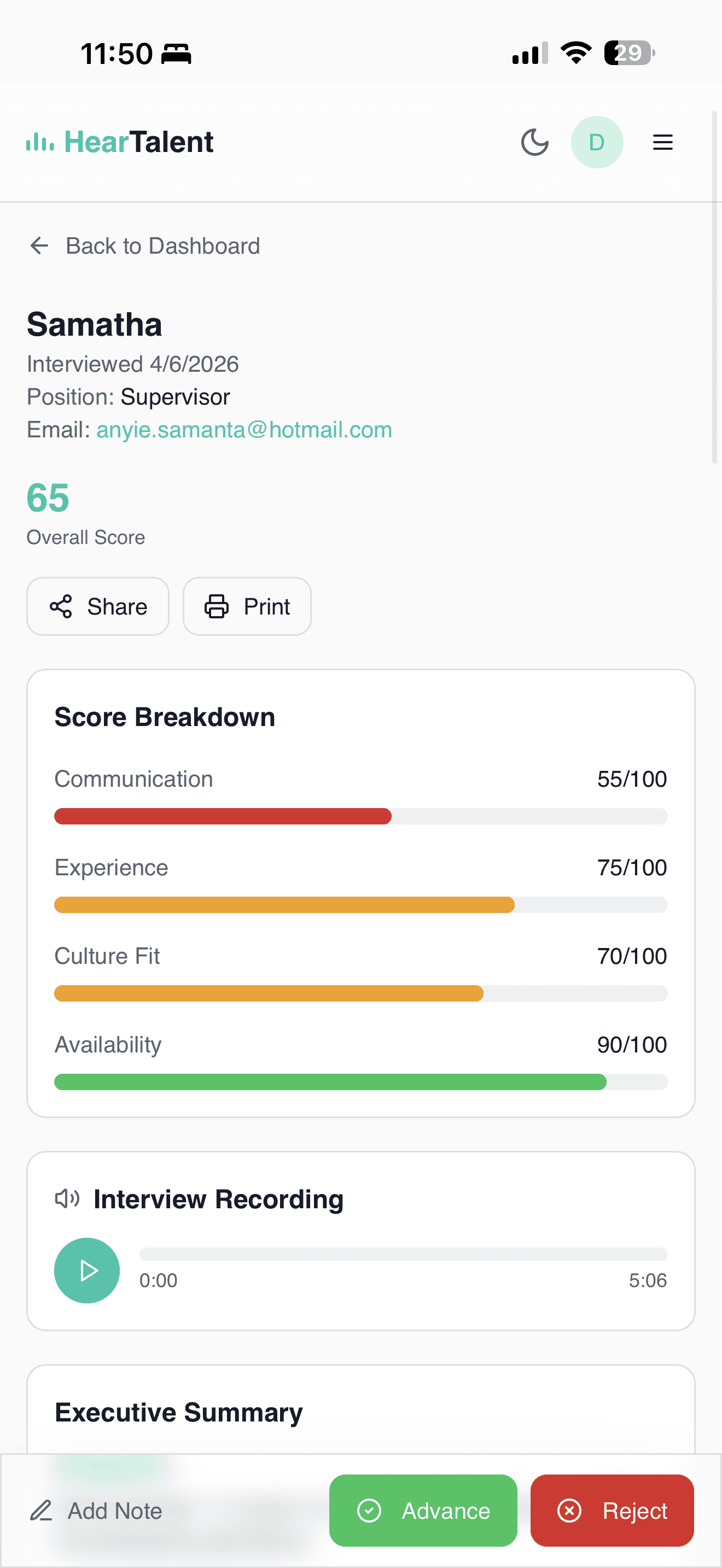 Post a job, share a link, and HearTalent conducts structured voice interviews automatically — scored and ranked before you even open your laptop.