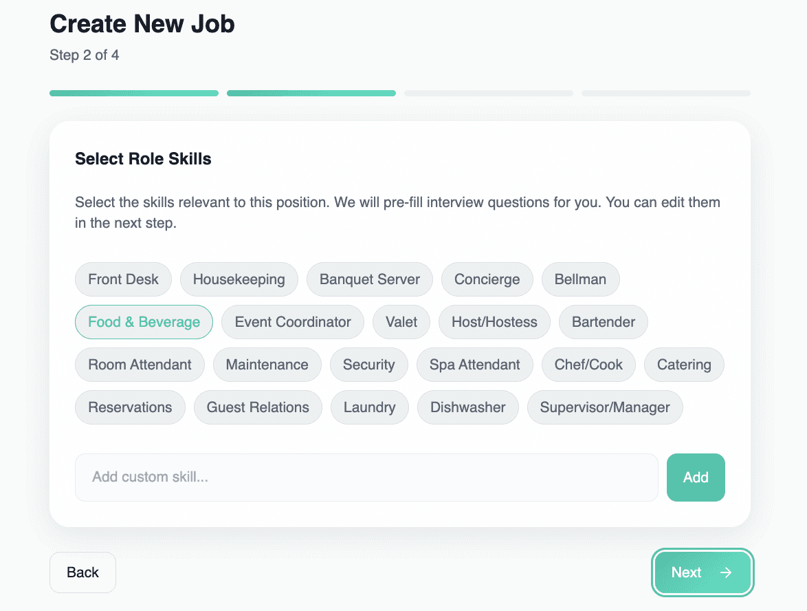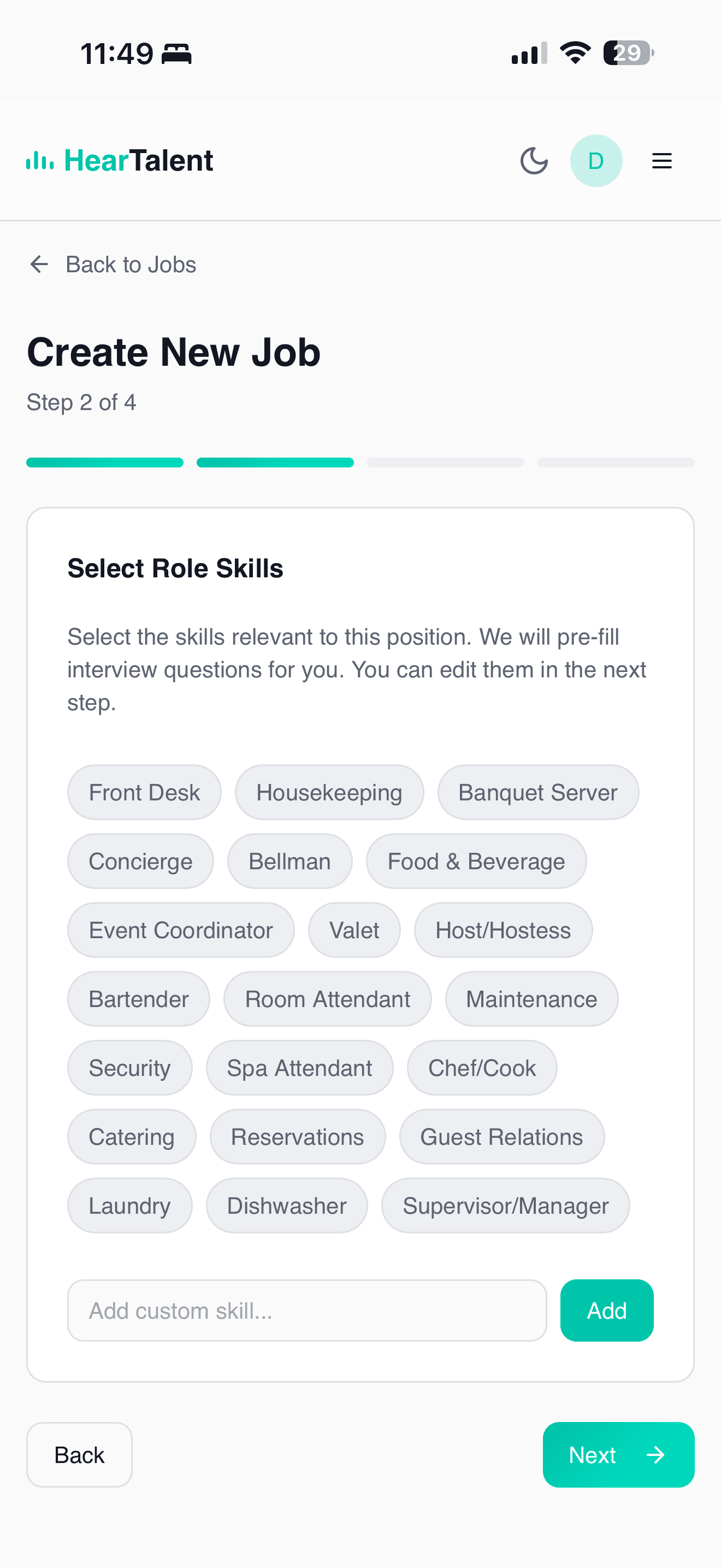 Run interviews in English or Spanish. HearTalent switches languages automatically based on your job settings.